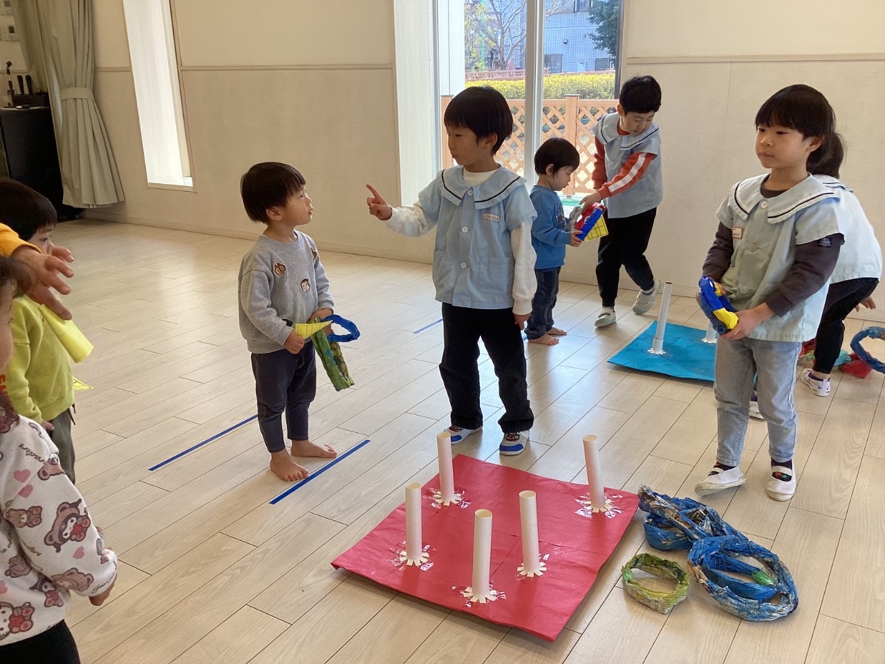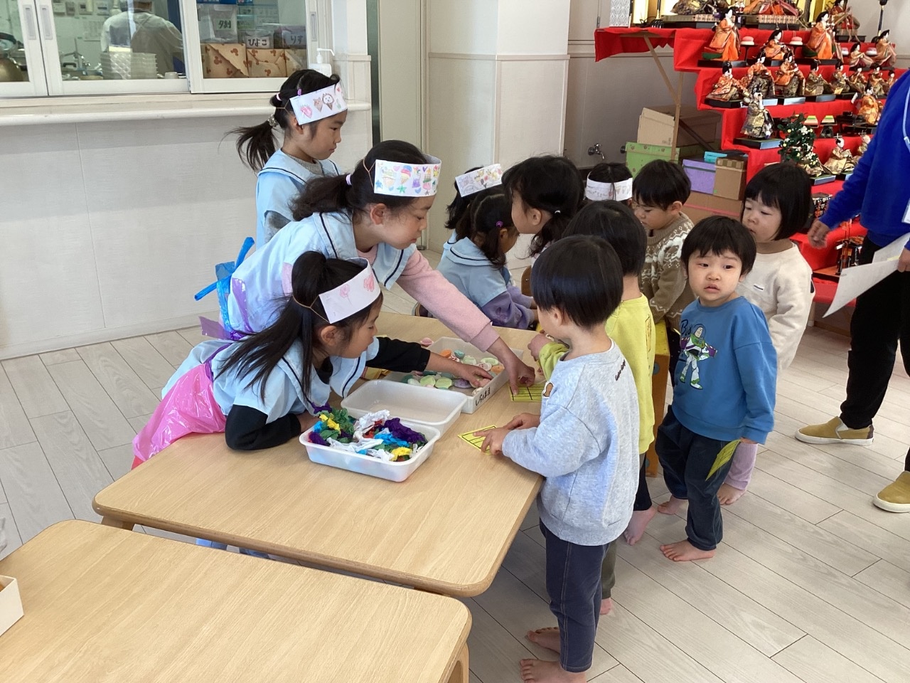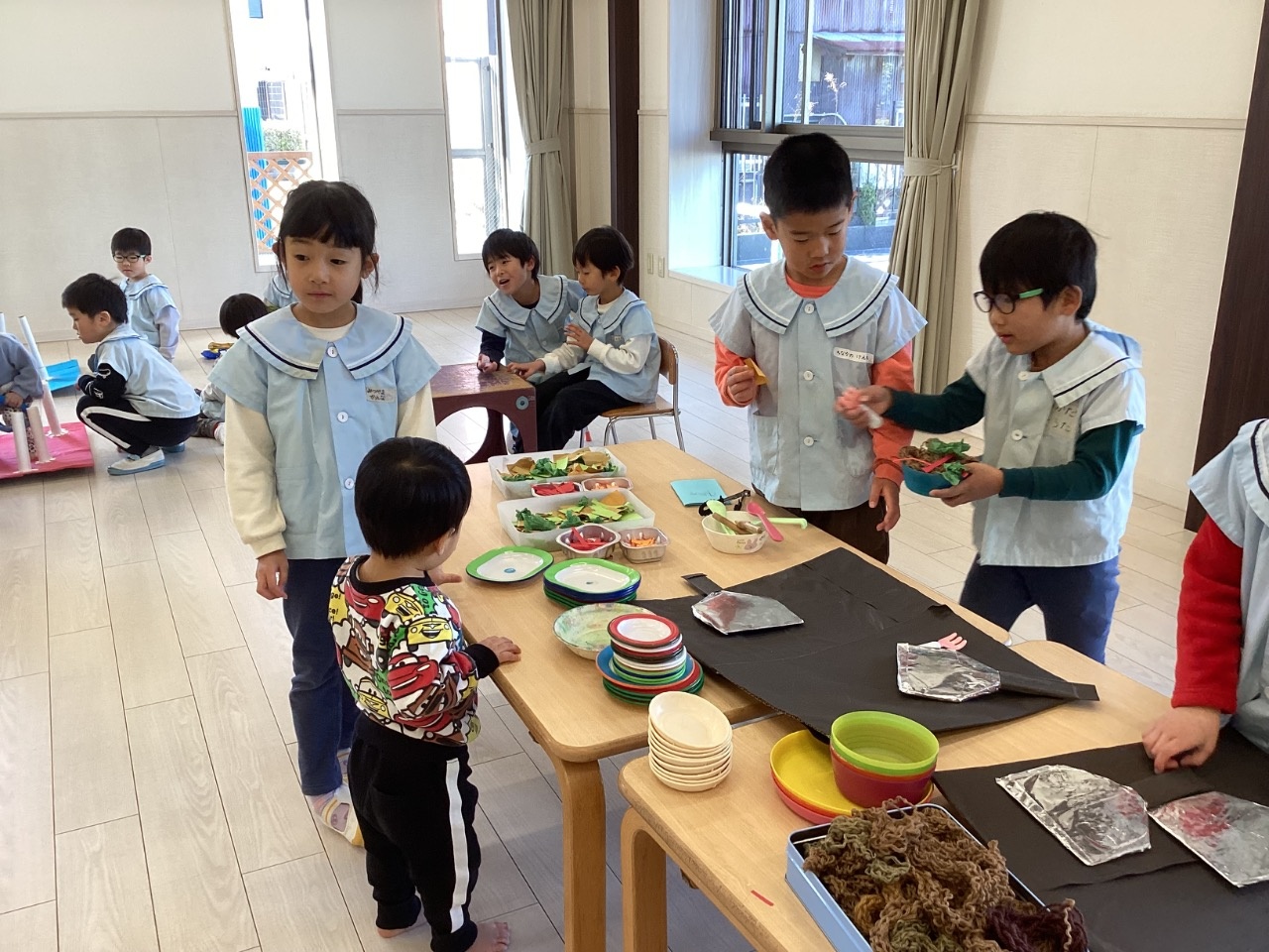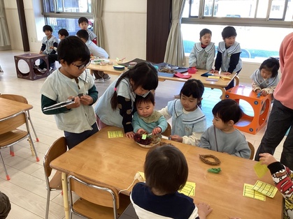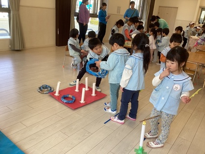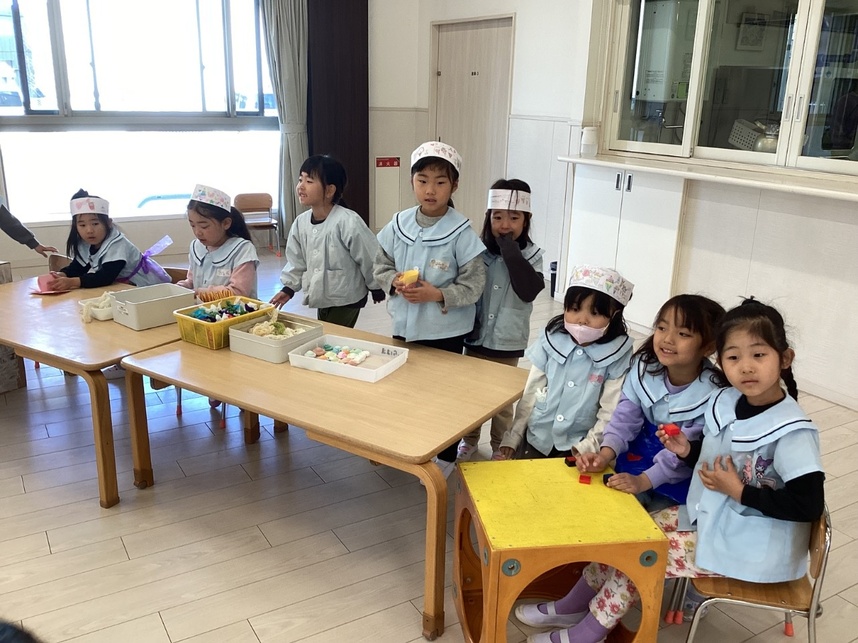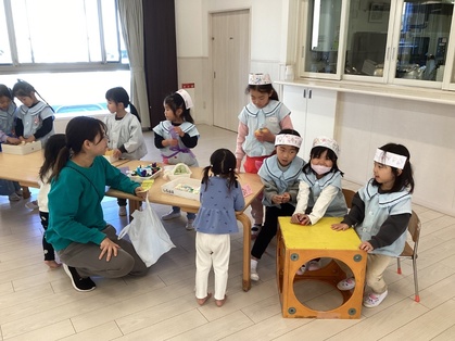 お店やさんごっこをしました。みんなで相談して「クレープ屋さん」「焼きそば屋さん」「わなげ屋さん」をやることに。「トッピングはなににする?」「やきそば、おおもりつくろうよ」「けいひん、おりがみでつくりたい!」とアイディアがどんどん出てきて、準備も協力して進めていました。